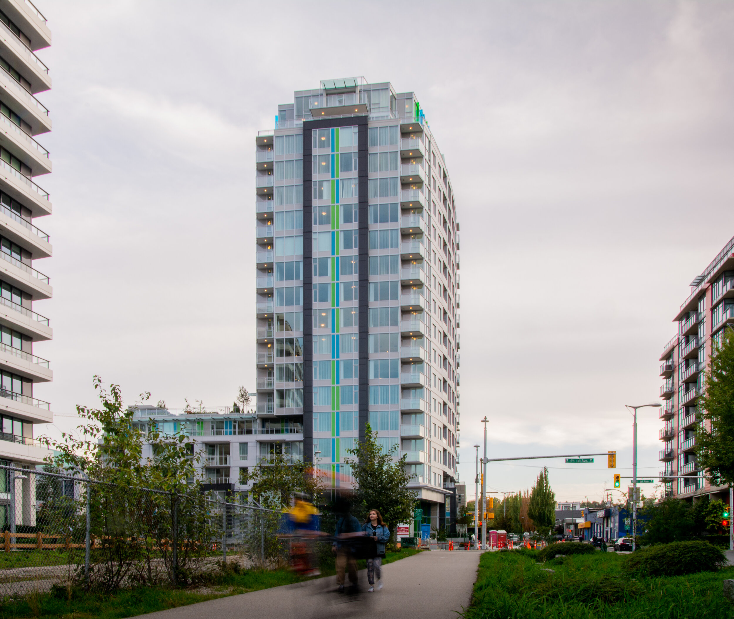 The material treatment of the project was inspired by the site’s industrial past along the historical shoreline of False Creek. A gently curved metal exterior with punched openings is reminiscent of the products produced in the metal works shop that once stood at this site. Blue and green glazed fins, inspired by the hues of the pacific, cast coloured light onto the surrounding surfaces. This dynamic effect creates a shifting expression of materiality throughout the day.
